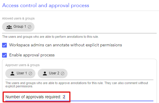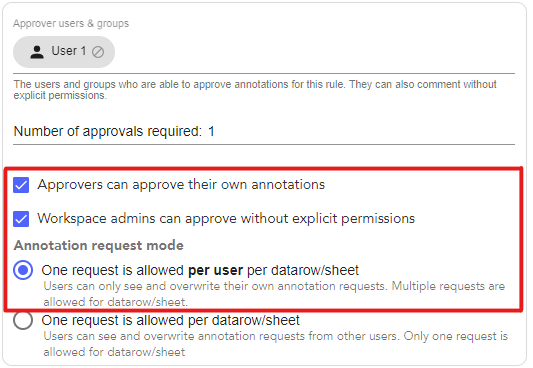 If the "Approvers can approve their own annotations" was not ticked, annotations made by User 1 could only be approved by User 2 and vice versa.