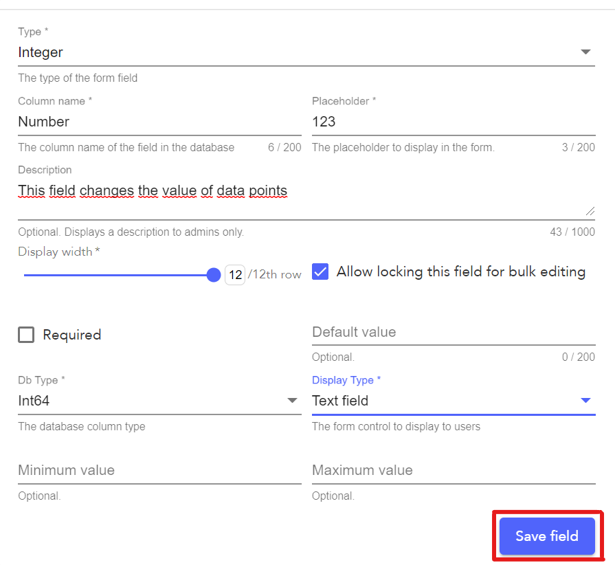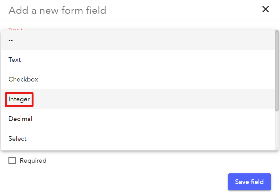 15. Select Type Integer for the form field as the value of the data point shall be edited on the Tableau Dashboard which is an Integer value