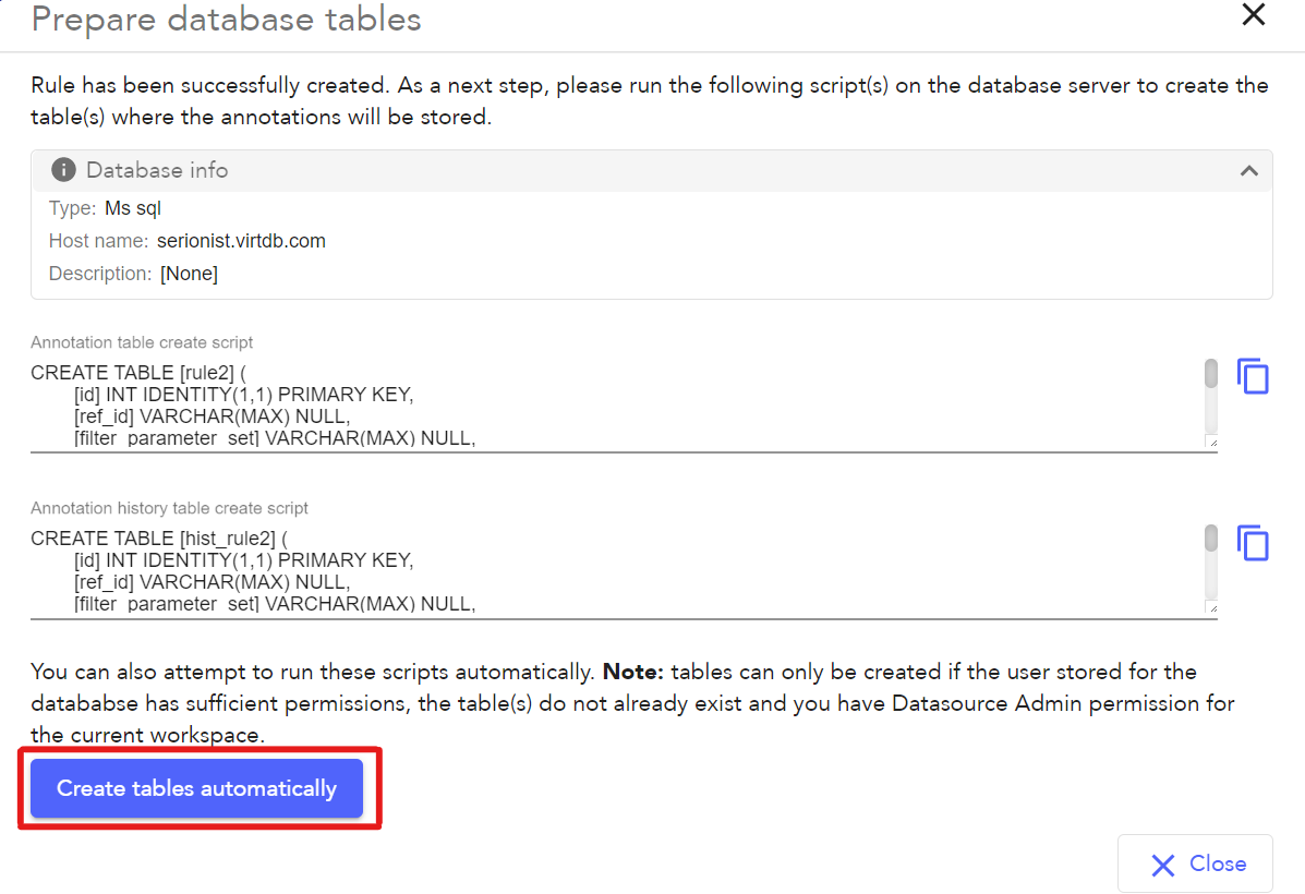 32. Click on "Create tables automatically" to create the tables automatically where annotations will be stored